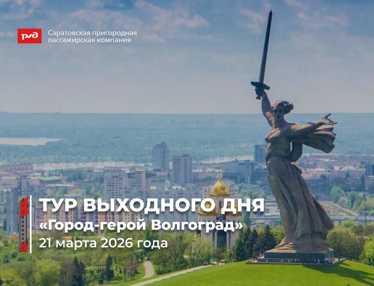 ! Отправляйтесь в незабываемое путешествие 21 марта 2026 года на электропоезде и прикоснитесь к истории города-героя. Всего пять часов в пути – и вы окажетесь в самом сердце Волгограда, где вас ждет насыщенная программа: ▶️Величественный Мамаев Курган, место ожесточенных сражений, где пройдет пешеходная экскурсия ▶️Обзорная автобусно-пешеходная экскурсия по городу с посещением знаковых мест: "Орудия Победы", руины мельницы Гергардта - здание, сохранившееся со времен Сталинградской Битвы, дом сержанта Павлова, фонтан "Танцующие дети", площадь Павших Борцов, Вечного Огня, Тополя Победы, Аллеи Героев ▶️ Музей-панорама "Сталинградская битва" (билеты не входят в стоимость экскурсии) 🚆 Поездка на электропоезде – это комфорт и удобство, а наша экскурсионная программа позволит вам максимально эффективно использовать время и узнать много нового. 🕓 Расписание: - время отправления ЖД Вокзал, г. Саратов 06:38 (время местное) - время прибытия о.п. Мамаев Курган, г. Волгоград 10:50 (время моск