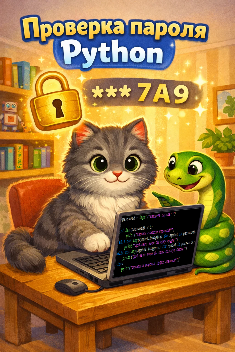 Это очень полезное умение — ведь почти в каждом сайте, игре или приложении есть защита паролем. А помогать нам будут наши друзья — кот Пуфик 🐱 и питон Пайти 🐍. Кот Пуфик решил создать секретный клуб любителей молока.