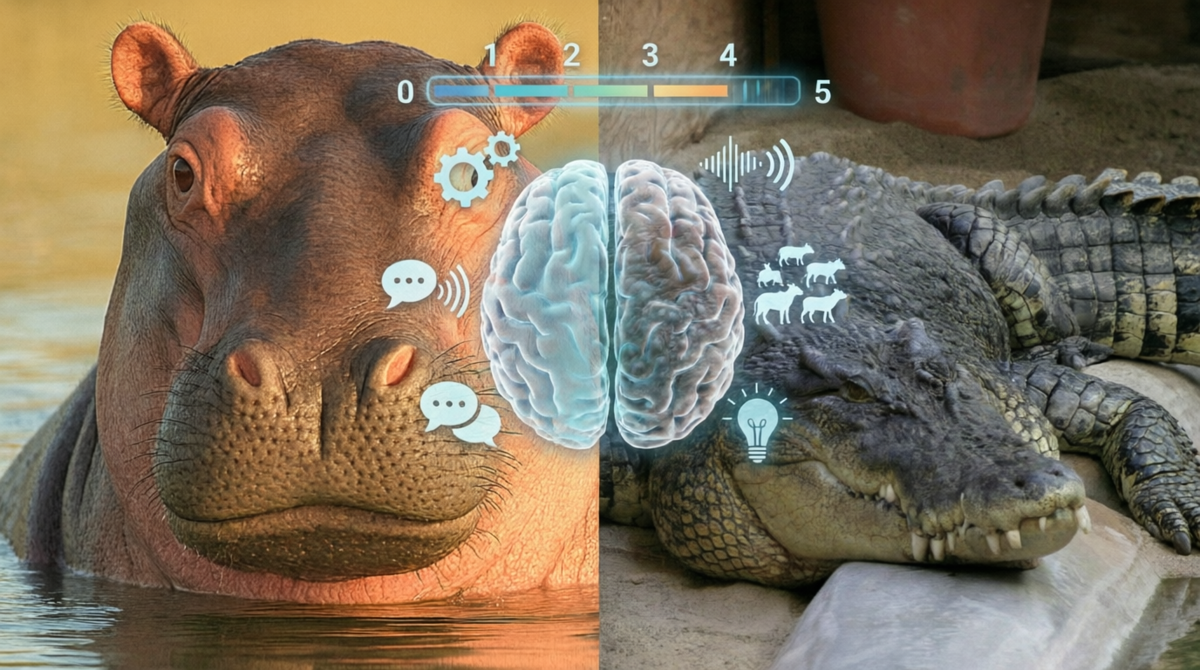 Оценивать будем по пятибалльной шкале, где 0 — способность не выявлена, а 5 — уникальный талант, подтверждённый множеством исследований. Важное предупреждение: баллы в этом сравнении нельзя переносить на другие статьи — в каждом сравнении мы по-разному настраиваем фокус, чтобы ярче высветить уникальные способности именно этой пары. Крокодил — 2 балла. Мозг маленький, но хорошо организован для своих задач. Исследования с помощью МРТ показывают, что передний мозг (отвечающий за сложное поведение) занимает более 50% объема мозговой полости. Хотя их коэффициент энцефализации (EQ) невысок, структура мозга позволяет обрабатывать сложные сигналы и демонстрировать развитое поведение. Бегемот — 1 балл. Здесь всё скромнее. Коэффициент энцефализации (EQ) бегемота — один из самых низких среди копытных, составляя всего 0.37. Для сравнения, у дельфина он около 4. Это означает, что относительно размеров их гигантского тела мозг очень мал. Эволюция не требовала от бегемота хитроумных стратегий для выж