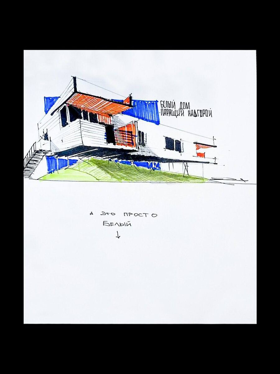 🔅 В одном из предыдущих постов мы по невнимательности сократили название нашего проекта до «Белый дом». На что обратил внимание наш коллега, архитектор Роман Ляхов, и совершенно справедливо заметил: полное название — именно «Белый дом, парящий над горой», и оно принципиально важно для понимания архитектурного замысла. ▶️Роман даже набросал эскиз с правильным названием, напомнив, что «Белый» здесь не цвет абстрактного объема, а часть образа — легкого, парящего над ландшафтом. ▶️Кстати, это один из первых проектов Кирилла Исаева, построенный для родителей. Дом находится в Нижних Сергах — живописном горном месте с видом на пруд. ⬛️ Деревянный каркас, обшитый металлом, установлен на тонкие сваи, что создает эффект парения над склоном. Белоснежный минималистичный объем контрастирует с таежным окружением, а выразительные стены и парапет формируют узнаваемый силуэт и защищают панорамные окна от лишних взглядов.