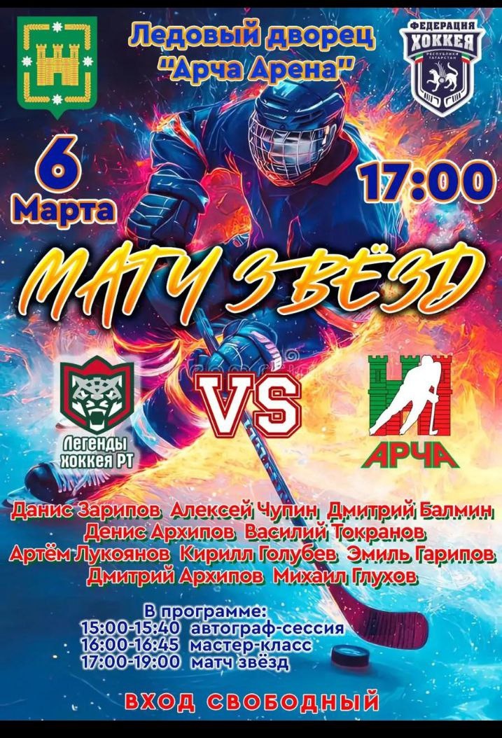 💫Әйе-әйе, йолдызлар матчы. Сәхнә йолдызлары турында сүз бармый, хоккей йолдызлары катнаша 🏒 Спортның бу төрен сөючеләр аларны бик яхшы белә. Данис Зарипов, Алексей Чупин, Дмитрий Балмин, Денис Архипов, Василий Токранов, Эмиль Гарипов, Артем Лукоянов, Кирилл Голубев, Дмитрий Архипов, Михаил Глухов Арчага килә. 📸Башта хоккейчылар белән фотосессия, осталык классы, аннан йолдызлар матчы була. Сәгать кичке 5 тә башлана. Фотога төшәргә уйласагыз, өчкә үк килергә кирәк була. 🥅Мондый мөмкинлекне кулдан ычкындырмагыз. ❕Керү ирекле.
