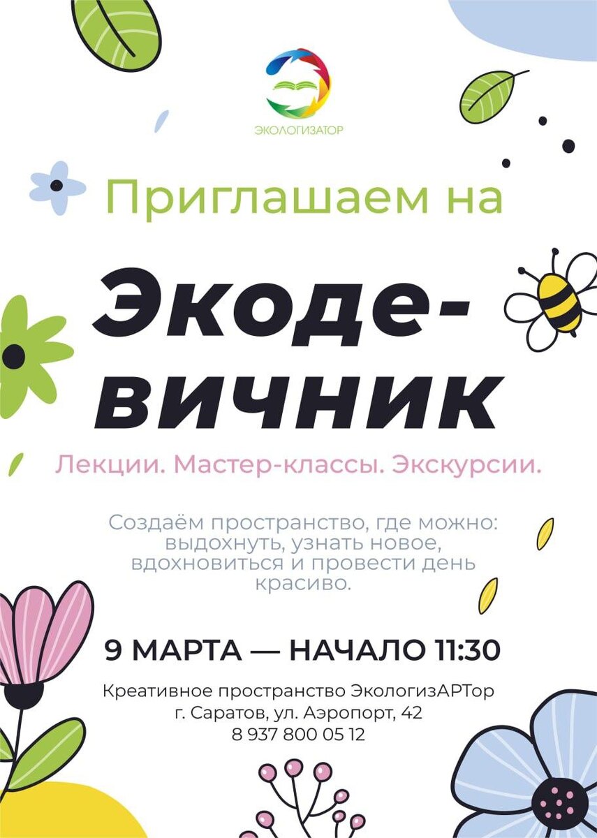 В пространстве ЭкологизАРТор гостей зовут выдохнуть, узнать новое, вдохновиться и провести день красиво. В программе: — экскурсия по арт-пространству и первому в городе музею переработки — лекция косметолога Татьяны Усольской — мастер-классы по созданию открыток, бижутерии и брелоков 📆 9 марта, 11:30 📍 ул. Аэропорт, 42 Прочитать подробнее можно здесь @relaxsaratov