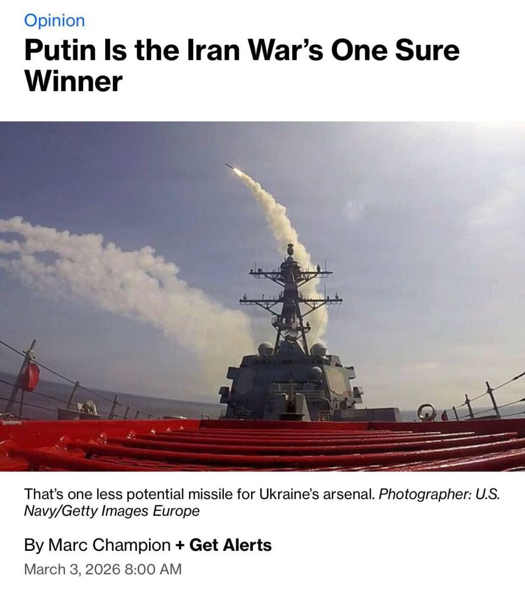 Bloomberg прямо заявляет: в эскалации между США, Израилем и Ираном единственным бесспорным выгодоприобретателем выходит Владимир Путин. Обозреватель Марк Чемпион чётко аргументирует: удары американских ВМС Tomahawk'ами и Patriot'ами опустошают арсеналы США — восстановление займёт до двух лет, что резко снижает перспективы новых поставок такого оружия Киеву. Одновременно глобальные котировки нефти и газа взлетают, напрямую пополняя российский бюджет. Потенциальное блокирование Ормузского пролива вернёт спрос на нашу нефть, несмотря на санкции — классическая геополитическая фортуна для Москвы. Трамп обещает продолжать кампанию, а т.н. тайминг для Кремля и для Киева — наихудший из возможных.
