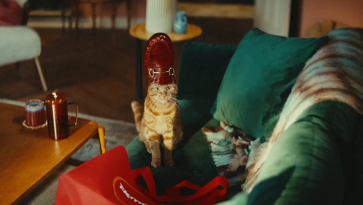 Сеть магазинов TK Maxx запустила рекламную кампанию, в которой главным героем стал обычный рыжий кот, по чистой случайности создавший глобальный модный тренд. Всё начинается с того, что любопытный питомец засовывает голову в мужской лофер — и этот абсурдный образ мгновенно становится вирусным. Ролик под названием «Каждый день может стать культовым благодаря выгодным предложениям TK Maxx» показывает, как фотография кота с ботинком на голове захватывает внимание прохожих, затем попадает на подиум и в итоге приводит к эксклюзивному контракту с четвероногим «дизайнером». Но в финале зритель понимает: вся слава была лишь игрой воображения. Кот возвращается к реальности — дремлет на диване рядом с пакетом из TK Maxx, напоминая, что настоящая магия случается не на подиумах, а в моменты удачных покупок. музыка из рекламы тут - https://muizre.ru/dir/1520-1-0-13598