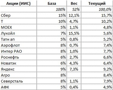 Текущий состав портфеля акций на ИИС, входит в общий портфель (35%). Вес указан по индексу