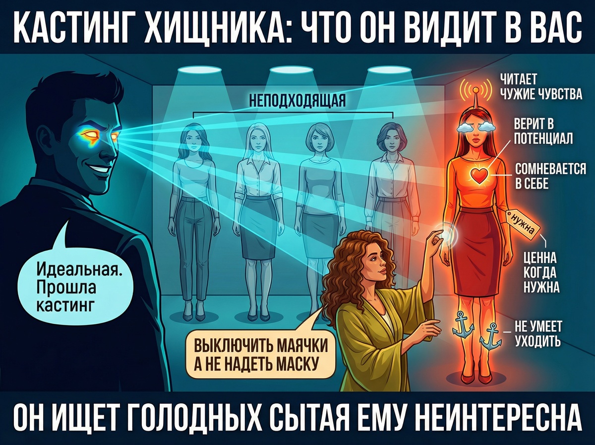 У нарцисса нет списка критериев. Он не сидит вечерами, составляя таблицу: “Эмпатичная — галочка. Самооценка хромает — галочка. Склонна к самопожертвованию — бинго”. Нет. Он работает тоньше. Как хищник, который не изучает анатомию антилопы — а просто видит, какая отбилась от стада.