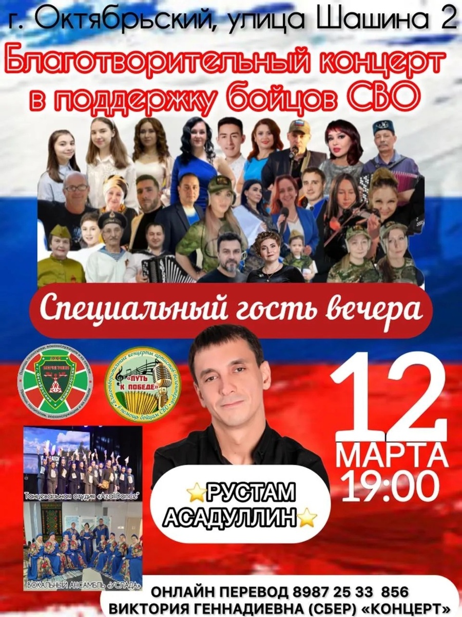 В Центре национальных культур состоится благотворительный концерт в поддержку бойцов спецоперации. Мероприятие организовано волонтёрской группой артистов «Путь к Победе» совместно с АНО «Берегиня». Специальный гость вечера — Рустам Асадуллин. Средства, собранные на концерте, пойдут на необходимые военнослужащим вещи. Концерт пройдёт 12 марта, в 19.00.