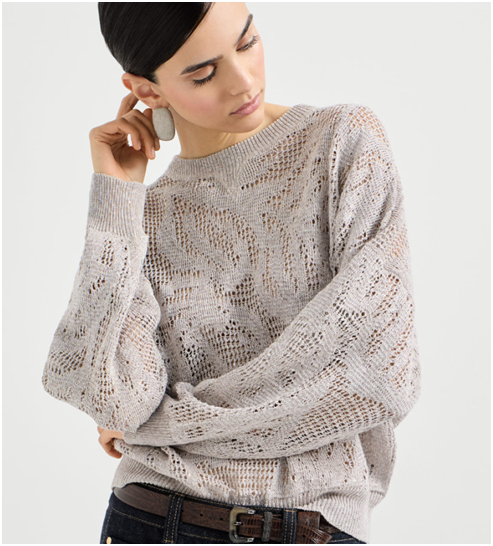 Цветочным узором с эффектом кружева связаны несколько моделей из коллекции Брунелло Кучинелли весна-лето 2026. Обзор моделей из весенне-летней коллекции можно посмотреть здесь: