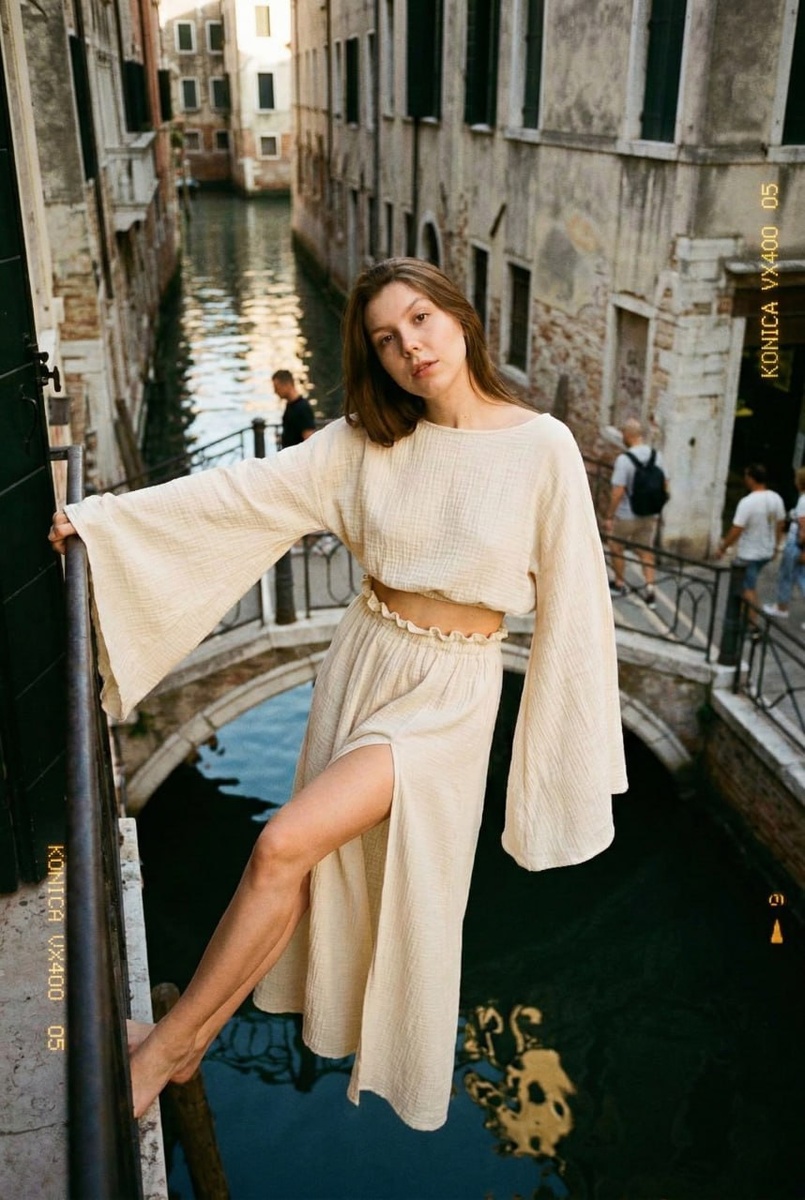 Серия прогулочных промтов "Венеция" 🌟 4 из 5 Street photoshoot in Venice. High angle bird's-eye view looking down from a balcony into a narrow Venetian alleyway (calle) as the girl steps over a small arched canal bridge. Portrait photo of a girl dressed in. Top (Crop Top): Loose fit with a wide boat neckline. The most prominent feature is the extremely wide, long, dramatic bell sleeves that flare out from the shoulder. Short length. Bottom (Skirt): Long maxi skirt with a high-rise elastic waistband with ruffles. The skirt features a deep, straight, dramatic slit up the front all the way to the thigh, exposing the leg when posing. Fabric and Texture: Premium, crinkled muslin (crinkled cotton) with a distinct, ruffled, crinkled texture throughout the fabric. Natural cream color. --Golden hour sunlight, warm outdoor lighting. --Shot with Canon Sure Shot K Date camera with expired Konica VX 400 film --Long exposure 1/25 sec --ar 2:3 〰️Жми на эту ссылку и примеряй готовые шаблоны! ❤️�