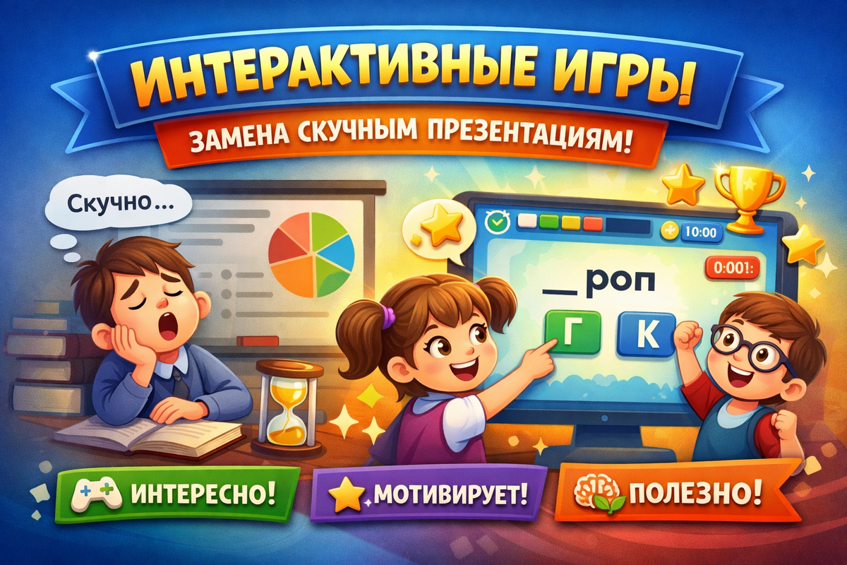 Каждый учитель хотя бы раз замечал: презентации, которые когда-то вызывали интерес, со временем превращаются в фон. Слайды мелькают, дети смотрят — но не всегда включаются. Внимание рассеивается, активность падает, мотивация снижается. Сегодня на смену «перелистыванию слайдов» приходят интерактивные игры — формат, который не просто демонстрирует материал, а вовлекает ребёнка в действие. 📌 Ученики становятся зрителями, а не участниками.