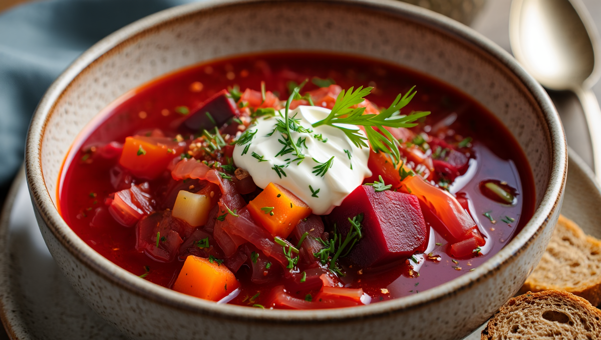 💡 Совет: Сметану подавайте отдельно, чтобы сохранить визуальный контраст красного борща и белого кремового цвета.