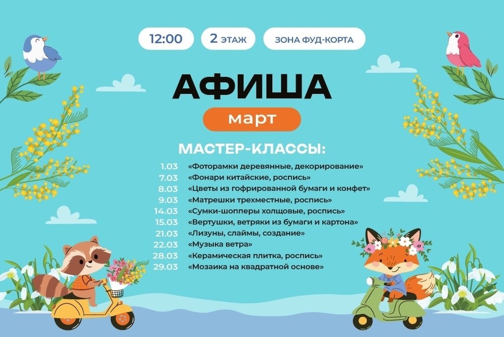 ! Будем делать цветы из бумаги, расписывать шопперы, создавать слаймы и составлять мозаику. ❕ Регистрация осуществляется на месте через мастеров, так что не нужно беспокоиться о предварительной записи. ⏳ Начало в 12:00 🧷 Место: Москва, ул. Планерная, 7, 2 этаж в зоне фудкорта. Ждём вас! Не забывайте делиться афишей с друзьями!