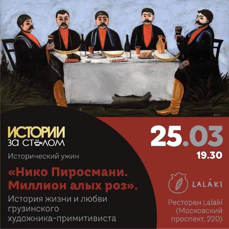 ❤️🔥 👨🎨Исторический ужин "Нико Пиросмани. История жизни и любви грузинского художника-примитивиста" 25 марта в 19.30 ☑️Ресторан Lalaki (Московский пр., 220) Лектор - историк Нанико Соколова. 🎼Жил-был художник один, Домик имел и холсты, Но он актрису любил, Ту, что любила цветы. Кто не знает эту песню, ставшую символом способной на безрассудства любви?! Основой для неё послужила романтическая история любви грузинского художника Нико Пиросмани и Маргариты де Севр. 🎨🎹Мы с вами поговорим об искусстве Нико Пиросмани, о его жизненном пути и, конечно, о легендарной любовной истории, вдохновившей на написание "Миллион алых роз". В меню: 1⃣Жареный халуми с трюфельным медом; 2⃣Чашашули с томлёной говядиной; 3⃣Классическая пахлава; 4⃣Шоти (грузинский хлеб из печи); 5⃣Чай. Стоимость - 5500 рублей на человека. Для записи пишите @AnnaShuniaeva или купите билет на сайте izastolom.ru