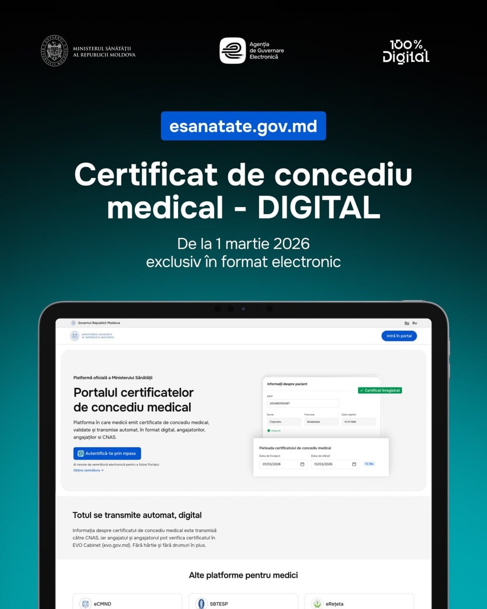 С 1 марта 2026 года в Молдове больничные выдаются только в электронном виде через платформу eSănătate. За первые 24 часа работы системы оформлено более 2300 документов. Пациентам больше не нужно приносить бумажные документы работодателю — все данные передаются автоматически и защищённо. ❗️Важно: медицинский осмотр остаётся обязательным, справка оформляется только после консультации врача. @eNewsmd.online