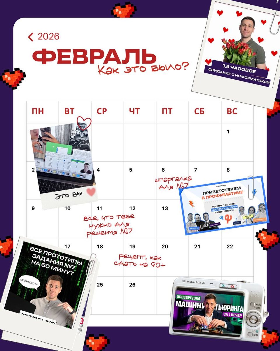 💚 Итак, время подвести небольшие итоги, каким же был предыдущий месяц и что он нам принес? ✅С 7 по 14 февраля мы открыли демо-неделю, на которую мог попасть любой желающий ✅Мы провели 4 крутейших открытых вебинара: — Все прототипы задания №7 — Разбор всех прототипов №25 — Все способы решения №15 — Машина Тьюринга: задание №12 ✅Подготовили две крутые шпаргалки по номеру №7 ✅ Разыграли 1,5 часовое свидание с информатикой ✅Анонсировали новый курс «Ключевая сотка» ps: еще можно присоединиться! ✅Собрали для вас все самые полезные функции и библиотеку по №25 ✅ Вывели настоящий рецепт, как выйти на 90+ ✅ Запустили марафон по №26 для учеников «Ключевой сотки» ✅Провели 4 занятия для группы «Максимум» ✅ А всего провели с вами 32 часа на всех вебинарах 🐱Из плохих новостей: скоро мы закрываем «Ключевую сотку» 🤩Из хороших новостей: вы еще успеваете присоединиться, не упускайте свой шанс!♥️