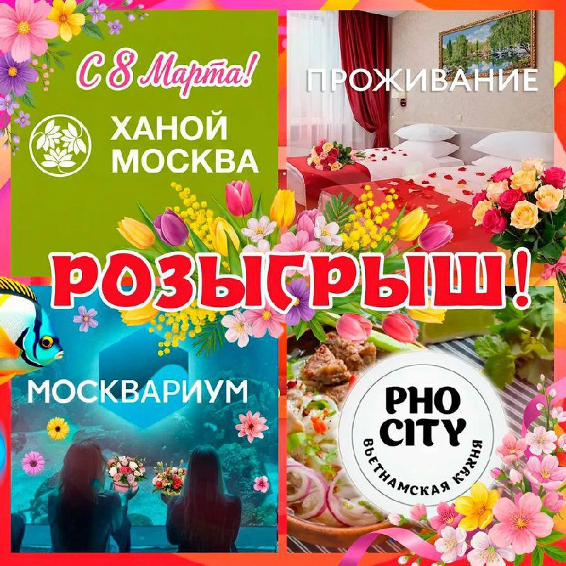 8 марта — день, когда весь мир празднует нежность, красоту и неповторимость женщин! От МФК «Ханой-Москва» — особенный подарок к самому весеннему празднику: РОЗЫГРЫШ МЕЧТЫ! 1-е место: Сутки роскошного проживания в нашем уютном апарт-отеле — утро с видом на город и море комфорта! 2-е место: Сертификат на 2000 ₽ в кафе «Фо Сити» — нежный вьетнамский фо, свежие спринг роллы и экзотические десерты для души! 3-е место: 2 билета в Москвариум — волшебное погружение в подводный мир с акулами, скатами и тысячами разноцветных рыбок! Как участвовать? Все просто и нежно: Достаточно подписаться на страницу«Ханой-Москва» в ТГ канале - https://t.me/hanoimoscow Разыгрываем 6 марта в прямом эфире в 16:00! Вы достойны самого лучшего! Пусть этот праздник принесет вам море тепла, любви и приятных сюрпризов.