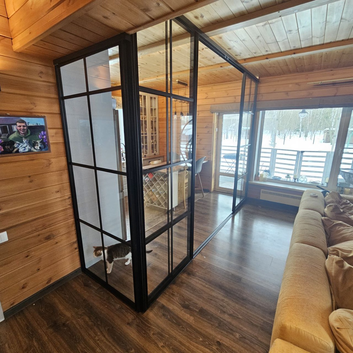 Но у наших клиентов свобода закончилась там, где начались любимые коты 😼. Каждый обед превращался в квест: «Успею ли я донести ложку до рта, или усатый бандит будет быстрее?» 🏃 💥Решение родилось гениальное и красивое — перегородка. Мы не стали отгораживать котиков от людей - они же члены семьи! Мы просто создали для них уютный наблюдательный пункт.😶🐱🐱 О самой перегородке: ✅ Крепление с нижней направляющей, так как дом каркасный и мы не попали на несущие конструкии. ✅ Прозрачное закаленное стекло, так как дома не только котики, но и дети. Все должно быть безопасно👌 ✅ 4 створки - 2 стационарные и 2 подвижные. Перегородка понравилась не только заказчикам, но и котикам, которые теперь смотрят через неё кулинарные шоу🐾