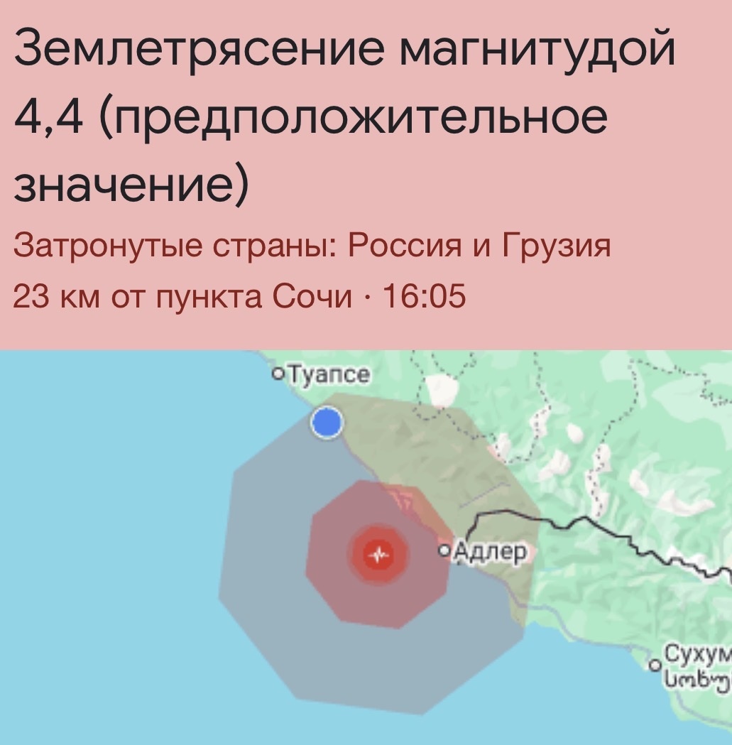 В акватории Черного моря недалеко от курортного города Сочи произошло землетрясение. По данным Европейско-Средиземноморского сейсмологического центра, подземные толчки магнитудой 4,4 были зарегистрированы на глубине 35 километров.