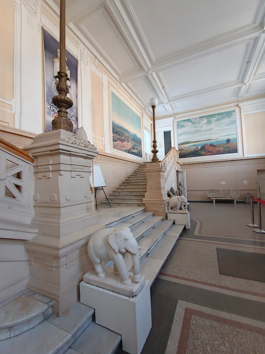 Но сильнее всего в Центральном музее Тавриды меня удивили высоченные потолки. Само здание было построено в далёком 1907 году для суда и поражает своими масштабами до сих пор. Высокие потолки, огромные двери, длинные лестницы. Кстати, ни у кого из сотрудников музея мы так и не смогли добиться сведений о высоте его потолков, зато точно их этим вопросом озадачили. На мой взгляд, высота точно приближается к 5 метрам.
