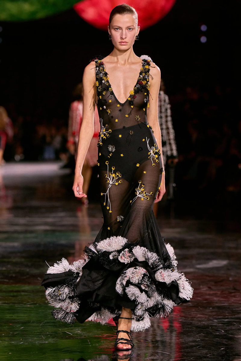 Вернемся к изображениям и выбору покупок, чтобы принять их... Каждое лето макси-платье возвращается и становится незаменимым элементом летнего сезона. Удобное и элегантное, оно идеально подходит для жарких летних дней. Легкое в носке, оно мгновенно создает изысканный образ без особых усилий. Платье макси станет идеальным дополнением к нашему летнему образу в сочетании с туфлями на каблуке или сандалиями. Прозрачное, вязаное крючком или даже с оранжевым оттенком макси-платье завоевывает популярность и переосмысливается на подиумах. Вернемся к 5 тенденциям, которые были замечены на показах коллекций весна-лето 2026. В последние годы прозрачное платье окончательно закрепило за собой статус одного из обязательных предметов гардероба. Это смелый выбор, который в сезоне 2026 года можно стилизовать как с лаконичным нижним бельем, так и в более сложных многослойных образах. На своем дебютном показе для Chanel дизайнер Матье Блази представил уникальную версию этого тренда: платье, украшенное ро