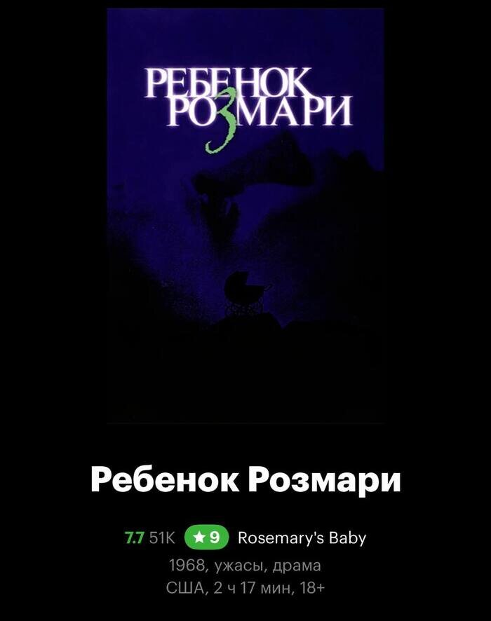 Это было очень круто. Ла ла бла бла, я не фанат ужасов, да да, просто это культовый фильм, на него есть отсылки в других фильмах, ремейки, он прошел проверку временем. Атмосфера Нью-Йорка 70-х, да и вообще как тогда жили люди при деньгах, мы щас так не живем. Ощущение того что тебе некуда бежать, что вокруг сговор, надвигающееся зло, тайное общество или бред, желание хорошо жить, хорошей быть, а может это и вправду загон. Концовка, где не понятно, что там с ребенком Розмари по началу вызывало чувство неудовлетворенности, но потом понимаешь, что недосказанность и воображение лучше дорисует то, что могли показать в 1968 году. Источник, мой телеграмм: Герцог Австрийский. Подпишись
