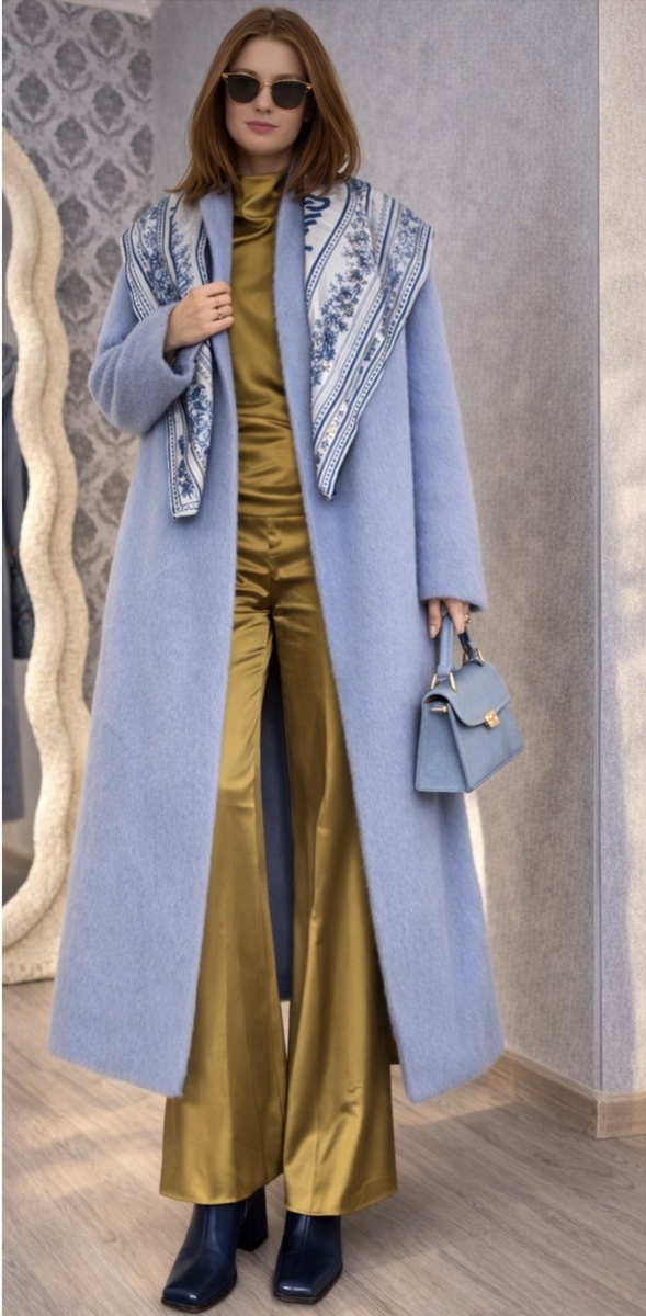 Центром композиции становится пальто в сложном холодном голубом оттенке. Это не яркое небо и не ледяной синий — это приглушённый, дымчатый тон, который работает как благородный фон.