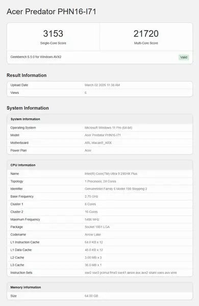 % Флагман линейки Arrow Lake Refresh появился в базе Geekbench и показал ощутимый прирост относительно предшественника. Разница не революционная, но заметная — особенно в многопотоке: • 24 ядра / 24 потока • 32 МБ кэша L3 • буст до 5,49 ГГц • 3153 балла в Geekbench 6 (Single-Core) • 21 720 баллов в Multi-Core • +6 % к однопотоку и +8 % к многопотоку относительно 285HX Релиз Arrow Lake Refresh ожидается в ближайшие недели: презентация намечена на 11 марта, а обзоры — с 23 марта. Достаточно ли +8 %, чтобы обновляться с 285HX? 😏 🌐 Наши каналы 🗺 #Intеl