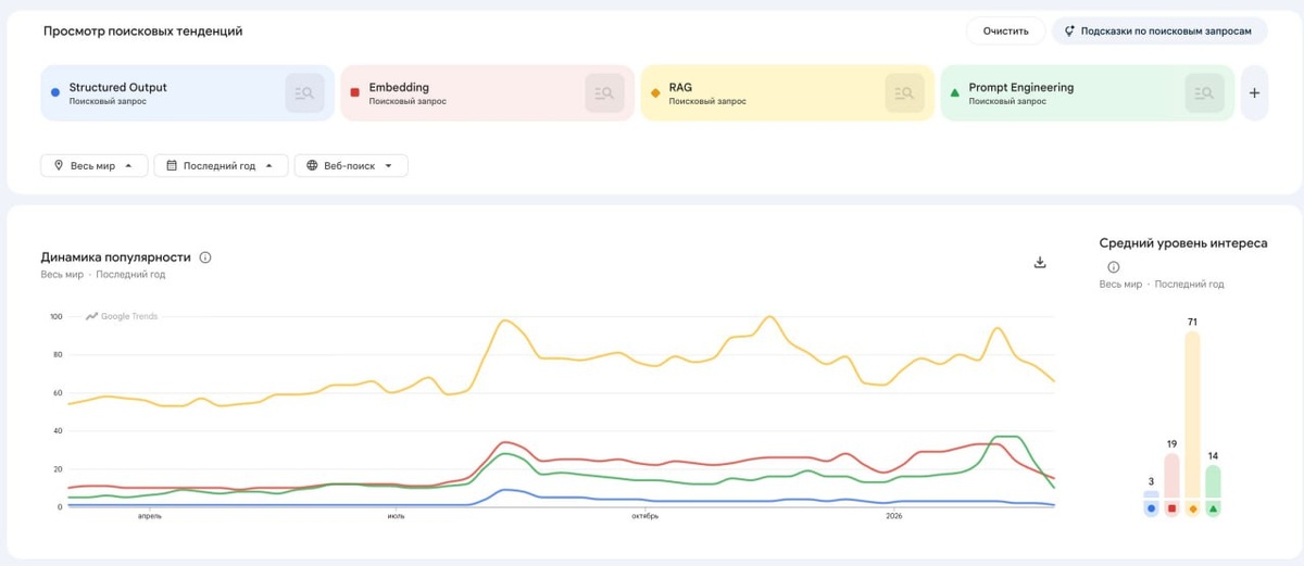 По трендам поисковых запросов можно отслеживать интерес к технологиям и, видимо, упрощать себе поиск работы. Нынче RAG в топе :)