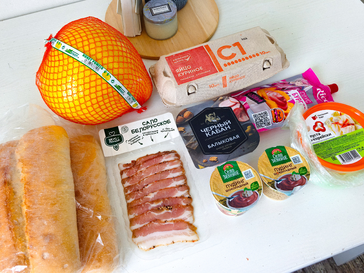 Погуляли немного, мусор выкинули, в магазин зашли. Дома внезапно закончились яйца - вот их купили, а ещё маринованную капусту, пару пудингов, пару чиабатт, колбасу, сало, соус и помело.