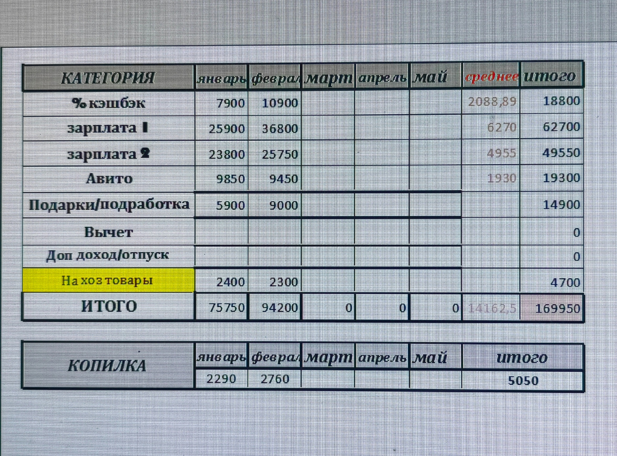 Всем Добрый день! Сегодня покажу вам итоговые таблицы по накопления и тратам, которые веду с момента внедрения метода конвертов в свой семейный бюджет. В Феврале у меня было четыре распределения. Распределяла наши с мужем зарплаты, аванс, подработки и дополнительный доход от продаж на авито. Распределяю деньги на три бюджетника и копилку: 33% в накопительный 33% в детский 31% в семейный 3% в копилку В накопительный органайзер за Февраль месяц было распределено – 31.450 руб. Траты были только в одном конверте. Резерв 3900руб – помог конверту детская одежда и здоровье. Общая сумма денег в накопительном органайзере – 214.900 руб. В детский органайзер за Февраль месяц было распределено – 31.200 руб. Траты были в шести конвертах Кружки - оплатила взнос на танцевальные костюмы Развлечения – 6.000руб Сходили с детьми в Термолэнд Одежда дети - 8.500руб – купила детям новые вещи Сад/Школа - 1000руб пособия и канцелярия на занятия Здоровье – 8450руб – Аптека и дерматолог дочке Игрушки потрачено