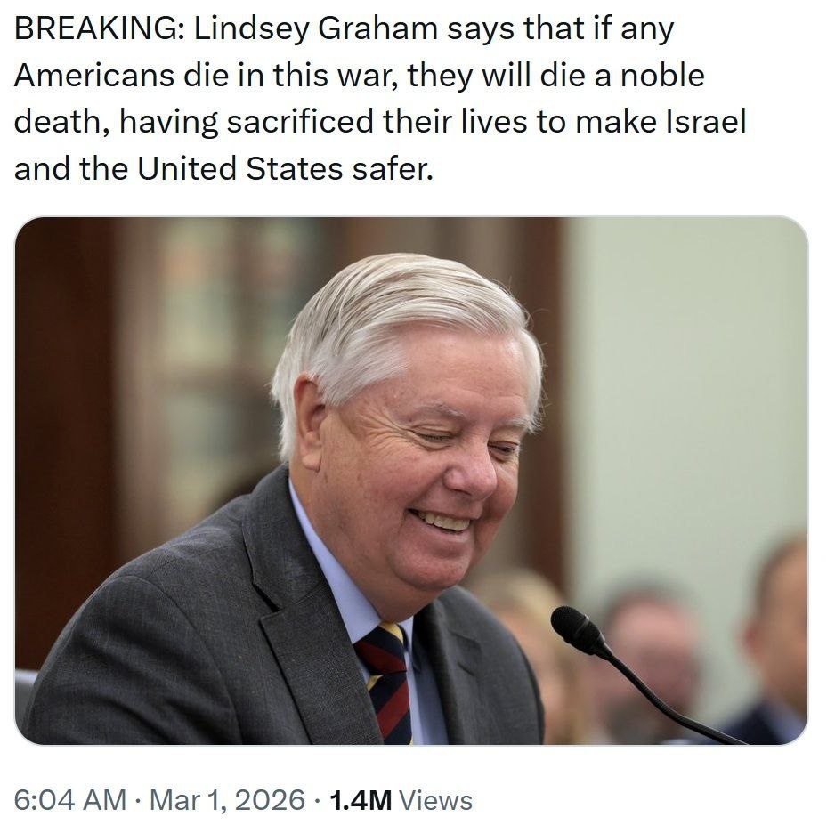 Сенатор Линдси Грэм сказал, что если кто из американцев и погибнет на этой войне, это будет благородная смерть, потому что они пожертвуют собой ради безопасности Израиля и США.