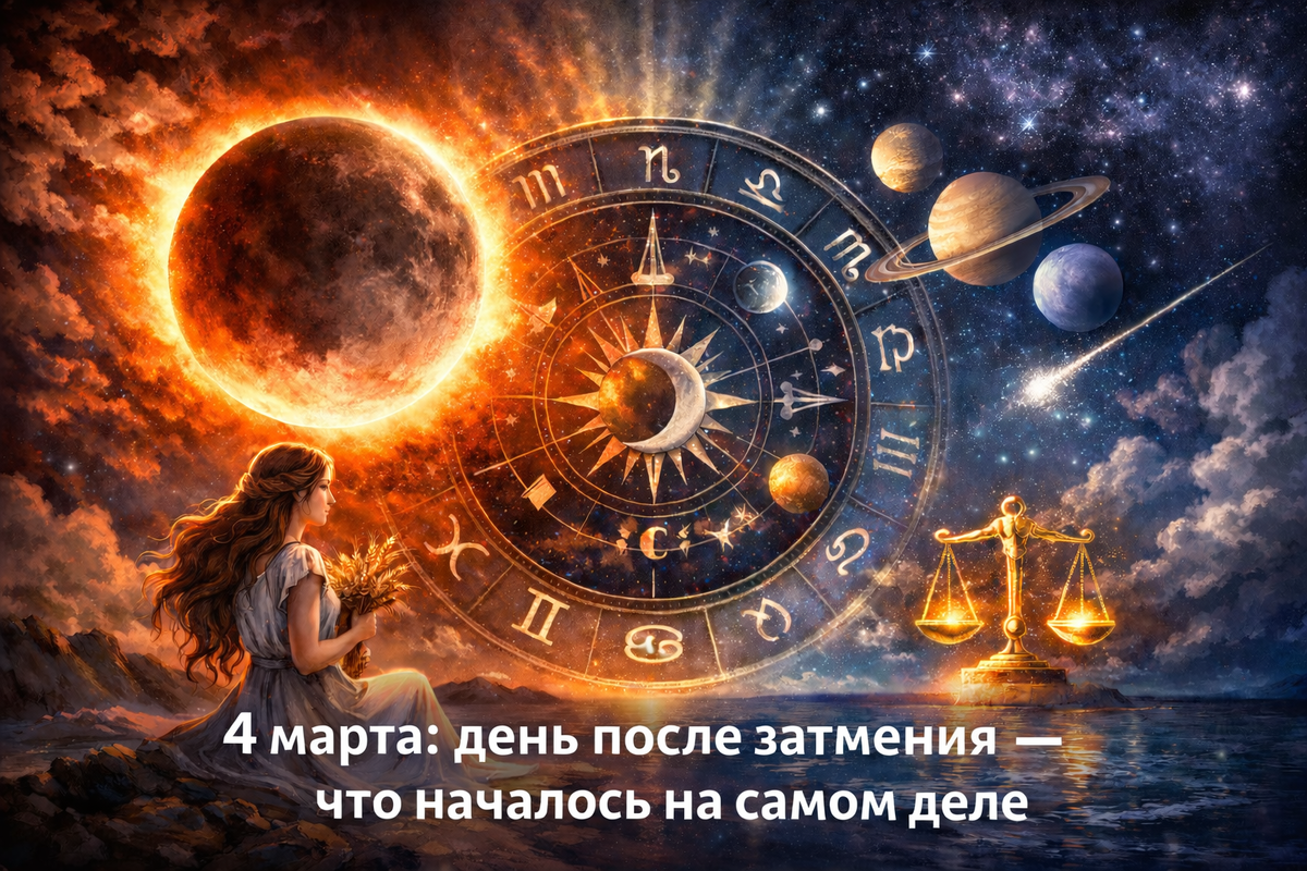 4 марта 2026 г. - первый день, когда его последствия начинают проявляться в реальности. Это момент, когда скрытые процессы становятся видимыми. Почти весь день идут 15 лунные сутки - один из самых напряжённых периодов лунного цикла. Это время искушений, внутренних провокаций и эмоциональных перегрузок. Вечером (с 19:39) начинается 16-й лунный день - более спокойный, но уже после «внутреннего шторма». Луна весь день в Деве - знак анализа, чистоты и порядка. Затмение усилило эту тему: всё лишнее должно быть убрано. Но важно понимать - очищение редко бывает мягким. Солнце и ретроградный Меркурий в Рыбах соединены с Восходящим узлом - судьбоносные разговоры, возвращение прошлых тем, кармические встречи. Венера приближается к соединению с Сатурном и Нептуном (точность 7–8 марта). Это момент, когда: Венера в позитивном секстиле с Ураном даёт неожиданные повороты в любви и деньгах - внезапные признания, расставания или новые знакомства.