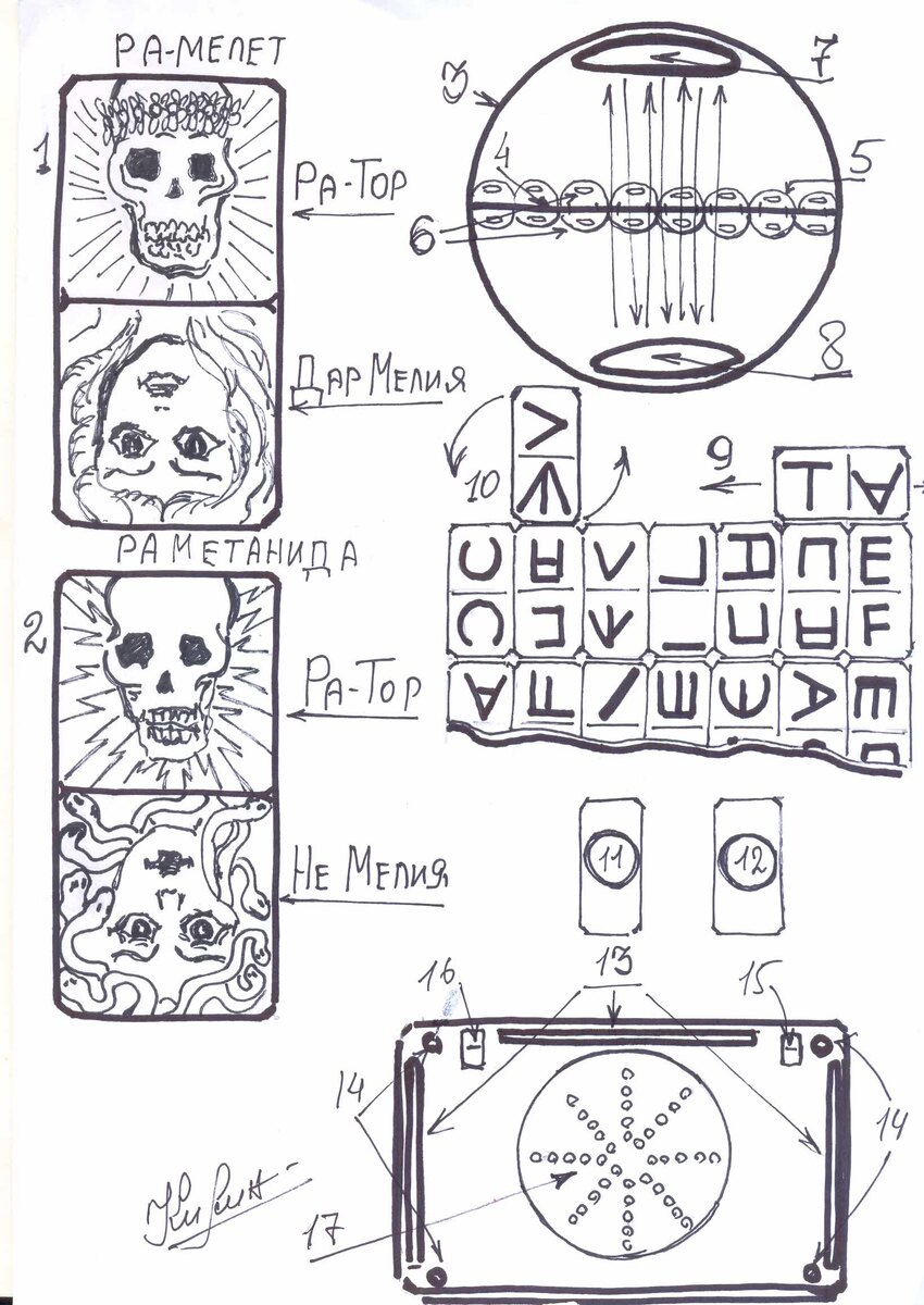 Основой проецирования вашего виртуального мира, являются противоположные информационные поля, которые в информационном плане имеют форму полусфер с зеркальным внутренним покрытием, соединённые в единую сферу. Вы живёте на поверхности двухмерного поля, рисунок 4, в одной из ячеек рисунок 5, между двумя зеркальными полусферами, верхней и нижней, рисунок 6, которые и создают дополнительную информационную контрастность в вашем трёх мерном мирке вашей Суды. А уже ваша Суда со всеми ячейками всего вашего палейного поля, находится в середине ещё большей сферы, которая и ограничивает всю вашу Палею, и тоже делится на верхнюю и нижнюю полусферы. А за пределами вашей Палеи, на вашем уровне, находятся другие Палеи, и такие же палейные поля, находятся как на нижних, так и на верхних этажах Мира Здания. Когда верхнее зеркало вашей Суды отражается в нижнем зеркале, то получается информационная Личность СЕМЕЛИЯ (которую вы называете Пиковая Дама), и данный симбиоз состоит из плоти Дьявола (нижнего поля), но имеет образ прекрасной девы от верхнего поля. НО!!! когда верхние и нижние зеркала вашей матриархальной Палеи отражаются друг в друге, то получаются две независимые информационные Личности. Сверху с зоны рисунок 7, на ваше палейное Поле, смотрит лик РА МЕЛЕТА, с низу с зоны рисунок 8, смотрит лик РА МЕТАНИДЫ. Ра Мелет, это богиня сотворения всего, что находится в вашем Матриархальном Мире, а Ра Метанида, это утилизатор всех не нужных и негодных творений. Рамелет, имеет два лика, 1 образ лучезарной златовласой девушки, или женской особи иной формы жизни, и 2 лучезарный череп с золотым ромашковым венком на макушке. Раметанида, тоже двулика, и 1 лик это мрачный череп в окружении ореола из пурпурных ветвиг (молний), и если внимательно присмотреться к молниям, то вы увидите, что это змеиные скелеты. 2 лик, это очаровательный лик девушки, у которой вместо волос длинные пурпурные змеи, причём кожа лица глянцево золотого цвета. Платиновый череп с золотым ромашковым венком, и грязно золотой череп с космами из змеиных скелетов, имеют одинаковые названия и называются РА ТОРами. А вот Лик Рамелета называется ДАР МЕЛИЯ, и несёт цифру 1, а Лик Раметаниды, называется НЕ МЕЛИЯ, и несёт цифру 0. При раскладе, на каждой карте у вас две буквы, или цифры, НО!!!, при вскрытии в зависимости от положения карты, вы снимаете любые из восьми букв, так как каждый ВАР, при вращении переходит в любую из четырех букв. Обычно берётся весь сплошной горизонтальный или вертикальный ряд, и просматривается на возможное получение слова из имеющихся Варов. По периметру или по краям полей, имеются Лабильные Вары, и эти карты, можно ограниченно как передвигать, так и поворачивать для нахождения подходящих слов. По середине рабочего поля под стеклом, на всю ширину стола, находится карта Палеи рисунок 17, по бокам и перед вами, должны находится зеркала, необязательно большие, но с идеальным зеркальным коридором слева на право от вас, рисунок 13. По углам стола, горящие свечи, рисунок 14. На обратной стороне карты Рамелет, золотой круг, рисунок 11, а на обратной стороне карты Раметаниды, красный круг, рисунок 12. Во время расклада, в зависимости его типа, эти карты выкладываются отдельно по верхним углам рисунок 15 и 16. и при вскрытии их значение имеет то, где лик, а где череп, в верху, или в низу. И с какой стороны п