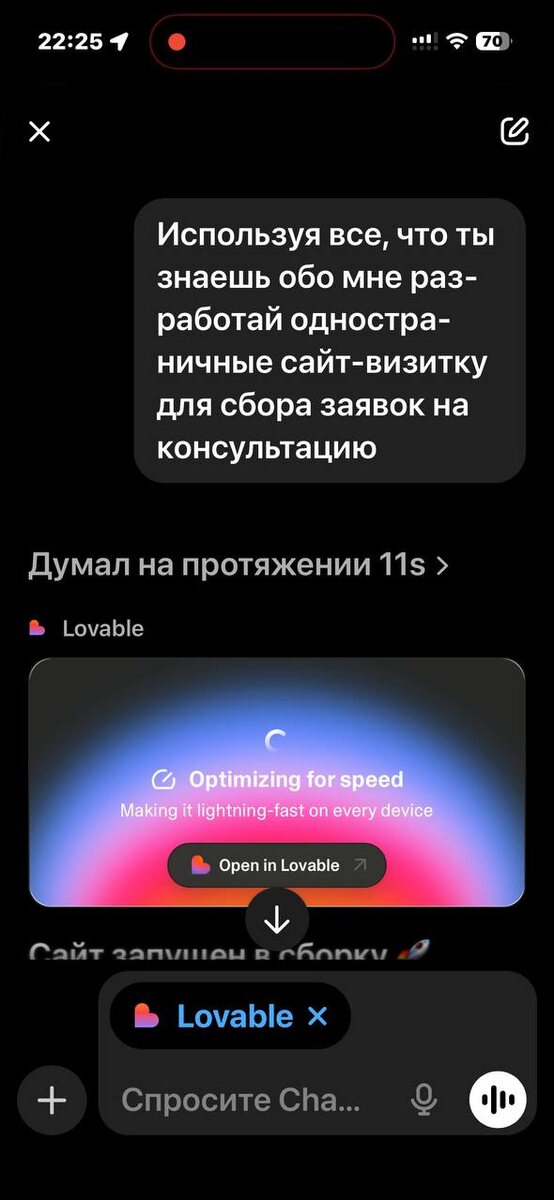 Разработка одностраничника с помощью ChatGPT + приложение внутри ChatGPT - Lovable. Ветка в ChatGPT Результат Промт: Используя все, что ты знаешь обо мне разработай одностраничные сайт-визитку для сбора заявок на консультацию Это даже промптом сложновато назвать. Но так как у меня история в чатике уже 2,5 года, он знает обо мне очень много, поэтому тут промпты и не нужны. В комментариях просили показать что-нибудь. Вот, очень практичная задачка на каждый день. Длительность выполнения: 7 минут. Стоимость: 0 рублей (приветственных токенов хватило). Как это работает: внутри ChatGPT есть куча приложений (которые работают у него внутри, то есть они интегрированы, никуда выходить не нужно из чатика). Вот, можно под задачу выбрать приложение, например для разработки лендингов и приложений можно взять lovable написать задачу и чатик все сделает. Дальше вы можете словами писать корректировки, он их внесет. Представляете, не надо писать ТЗ дизайнеру, потом ленденгисту, всех друг с друг