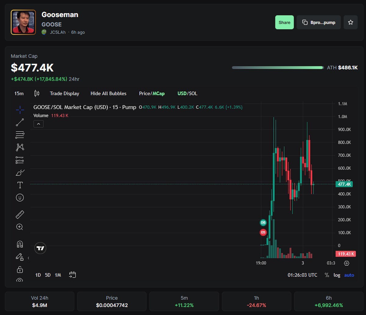 Мин «Gooseman» Ли поучаствовал в запуске мемкоина $GOOSE и, как сообщается, получил за это солидное вознаграждение