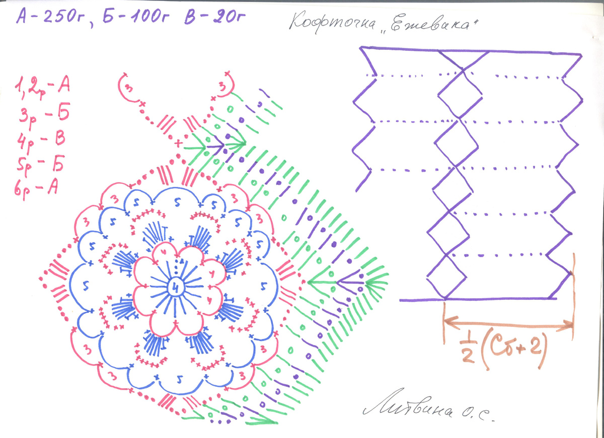 Для вязания кофточки "Ежевика" вам потребуется 250 гр. ниток "Ирис", "Ажурная", "Успешная" цвета "А", 100 гр. ниток цвета "Б", 20 гр. ниток цвета "В".