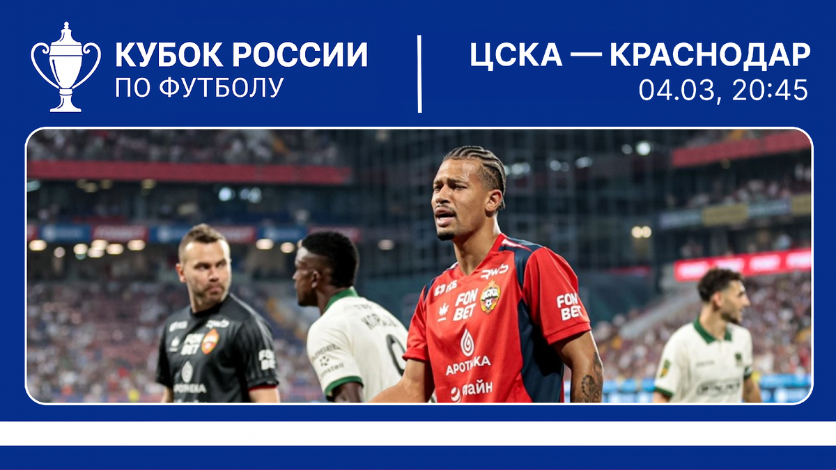 В среду, 4 марта, состоится матч первого полуфинала Пути РПЛ Кубка России между ЦСКА и «Краснодаром». Встреча пройдёт в Москве на стадионе «ВЭБ Арена» в 20:45 по московскому времени. Игру можно посмотреть бесплатно на канале «Матч ТВ». Коллектив Фабио Челестини начал весеннюю часть сезона с тяжёлого матча против «Ахмата» в гостях. У команды было много изменений в составе из-за дисквалификаций и новых трансферов. Впервые в официальном матче за клуб сыграли левый защитник Матеус Рейс, центральный защитник Кирилл Данилов, атакующий полузащитник Данила Козлов и нападающий Лусиану Гонду. Стоит отметить и грозненцев, которые выбегали в опасные контратаки и надёжно встречали «армейцев» на своей половине поля, плюс в плане борьбы явно не уступали, а может, и превосходили москвичей. По итогу ЦСКА проиграл первый матч РПЛ после зимней паузы с минимальным счётом 0:1, но стоит отметить, что у парней Челестини были хорошие моменты, и, скорее, встреча была ничейная. Также в Грозном не могли помочь к