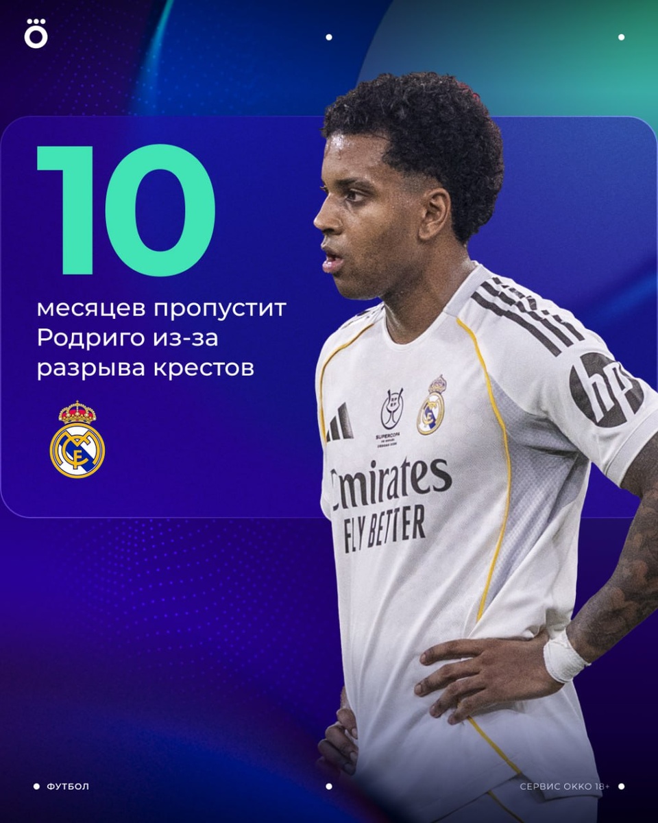 Официально: «Реал» подтвердил травму Родриго 😱 У бразильца диагностирован разрывы передней крестообразной связки и латерального мениска правой ноги. О футболе до конца 2026-го можно забыть 😢 😃 Смотри Okko прямо сейчас!