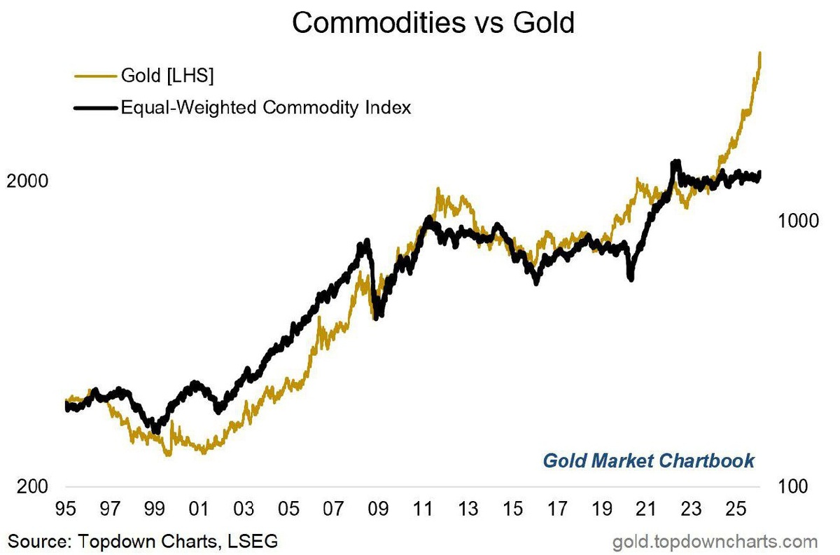 Многие инвесторы пытаются отделить золото от более широкого товарного рынка. В действительности же часто бывает наоборот. Золото часто задает тренды на других рынках сырьевых ресурсов.