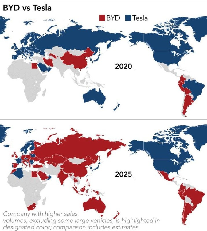 С 2020 по 2025 год BYD обошла Tesla по объёму продаж в 22 странах, сообщает Nikkei. Китайский автопроизводитель продолжает глобальное расширение из-за замедления продаж электромобилей на внутреннем рынке. https://dzen.ru/id/5c0e38ff46ef5c00aaa80527