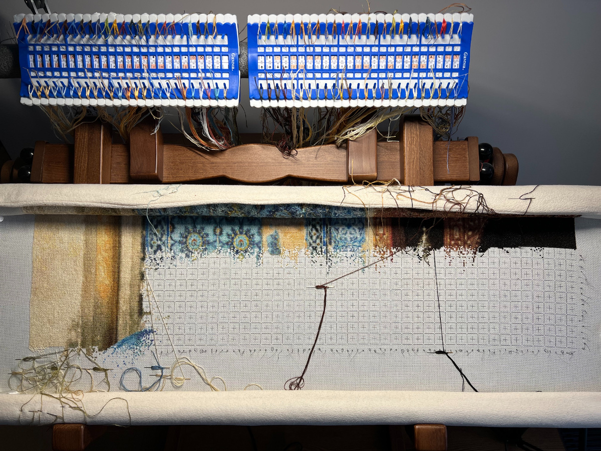 Привет, друзья! 💫 Давно не показывала свою «Игру в шахматы» от ЭСТЭ. А вышивка тем временем не стоит на месте! Я совершила плановую перемотку канвы и разметила новый участок — 9 квадратов в высоту. Вышивать планирую участками 30 на 30 клеток, но буду подстраиваться под схему. Смотрите, что уже вышито! 🧐 Тут вам и стена с колонной, и... сюрприз! Начало спины шахматиста. Да-да, это непонятное синее пятно на фото - это не начало плитки, это рубашка. Вот так неожиданно ворвался человек в мою вышивку. Но главное открытие этого этапа - психологическое. Раньше стена с колонной вышивалась быстро и легко. А тут я дошла до куска стены, которая по задумке художника... ГРЯЗНАЯ. 🤯