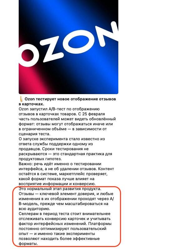 A/B-практика, ничего страшного. И у меня вопрос. Мы правда считаем нормальным тестировать отображение отзывов в высокий сезон? Сейчас больше всех возмущаются продавцы косметики. Не потому что тест только у них. А потому что перед 8 марта у них пик продаж. Любое изменение карточки в этот период особенно чувствительно. Отзывы — это не второстепенный элемент. Это ключевой фактор конверсии. Особенно в категориях, где много конкуренции и решение о покупке строится на доверии. И в реальности это выглядит так: ✔ Селлер готовился к сезону. ✔ Закупил товар. ✔ Запустил рекламу. ✔ И в момент максимального спроса у него меняется отображение одного из главных триггеров покупки. Да, это A/B-тест. Да, формально контент не удаляют. Да, платформа ищет “лучший формат”. Но если эксперимент влияет на доверие и конверсию — логично проводить его либо вне пиковых дат, либо на собственных товарах площадки. У Ozon их достаточно. И вот ещё один момент. Админ канала правда считает это нормальным? Или э