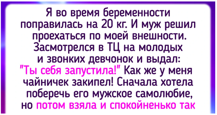 - Я во время каждой беременности поправлялась на 20 кг. И муж решил проехаться по моей внешности. Засмотрелся в ТЦ на молодых и звонких девчонок и выдал, мол, ты себя запустила, а могла бы выглядеть так же. Как же у меня чайничек закипел! Сначала хотела поберечь его мужское самолюбие, но потом взяла и спокойненько выкатила смету. Хочешь такую, чтоб ресничками хлопала, имела крутые волосы, маникюрчик, фигуру, одежду? Я согласна! Любой каприз, мой господин. Реснички — вот цена, волосы — вот цена, ногти — вот цена, спортзал еще хочу и массаж. Ах да, косметолог! Мой господин, хочу быть твоей красивой женой! Наивный думал, что ногти, прическа, ресницы — это бесплатно. От сметы поморщился, а услышав, что это надо делать регулярно, был в шоке, а потом отстал.
