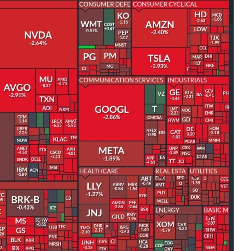 ⠀ Американский фондовый рынок переживает чёрный вторник. На фоне ударов по Ирану индекс Dow Jones рухнул сразу на 1200 пунктов (2,5%), а Nasdaq и S&P 500 валятся вслед за ним. Инвесторы в панике скидывают активы: в минусе оказались 95% компаний из списка крупнейших. Нефть марки Brent уже пробила отметку $84 за баррель после угроз Тегерана перекрыть Ормузский пролив. Сильнее всего рикошетит по авиакомпаниям — акции United и American Airlines просели на 5%. Пока весь мир считает убытки, в плюсе только оборонка и нефтяные гиганты типа ExxonMobil.