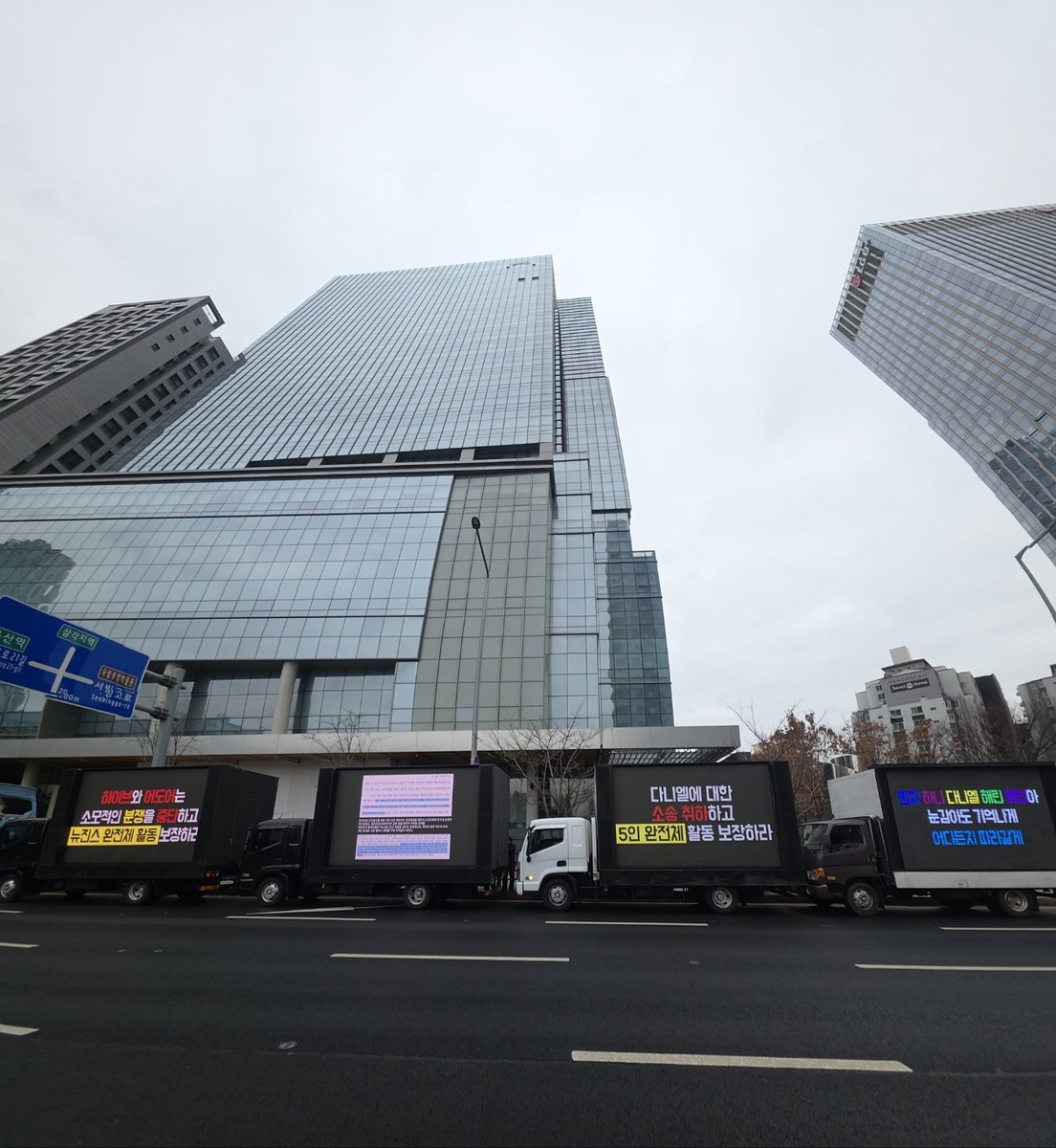 Команда Protest NewJeans Truck начала акцию протеста с грузовиками перед зданием Hybe