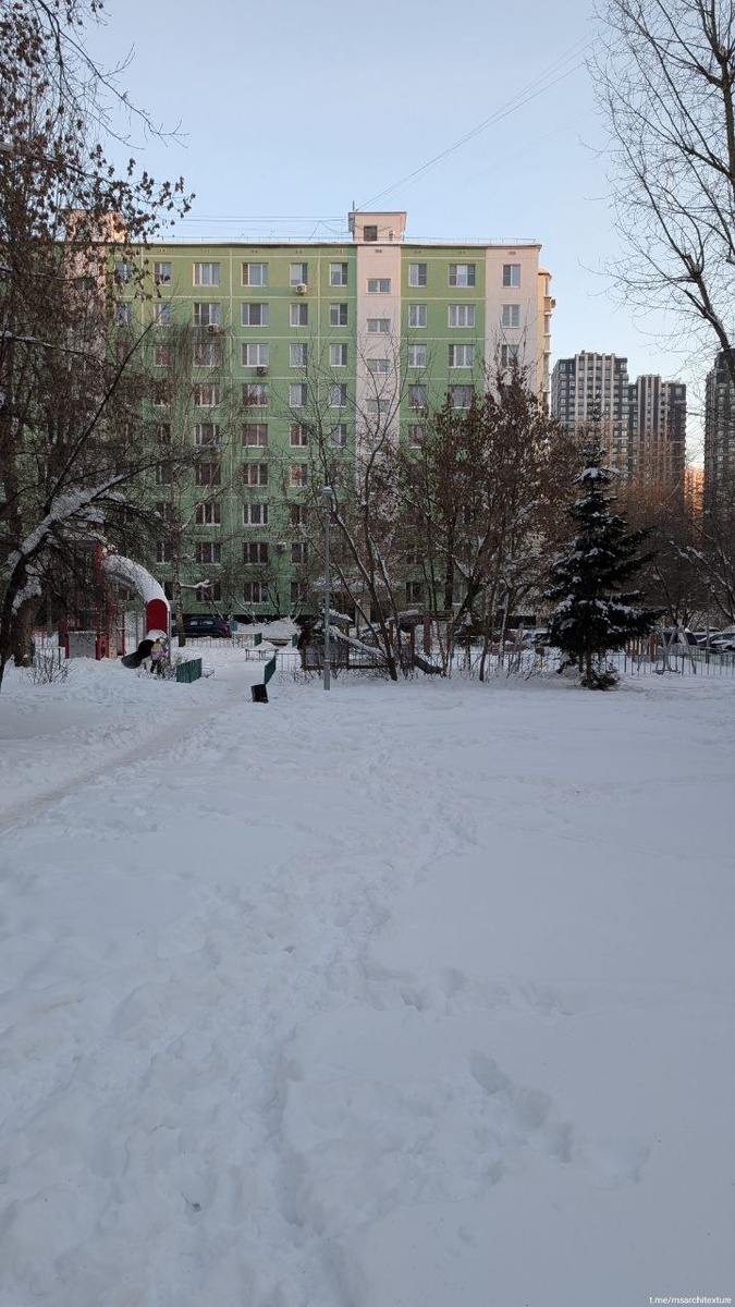 Как же хороши панельки после кап ремонта! Особенно одна сторона этой типовой серии II-49, где нет балконов (нечего остеклять). Тут интересно, что вместо плитки мы теперь имеем мокрый фасад с сохранением колористики. Ну и опять обидно за подъездные двери — очень плохо на фоне свежего фасада. 📱 Архитекстура #Москва #капремонт
