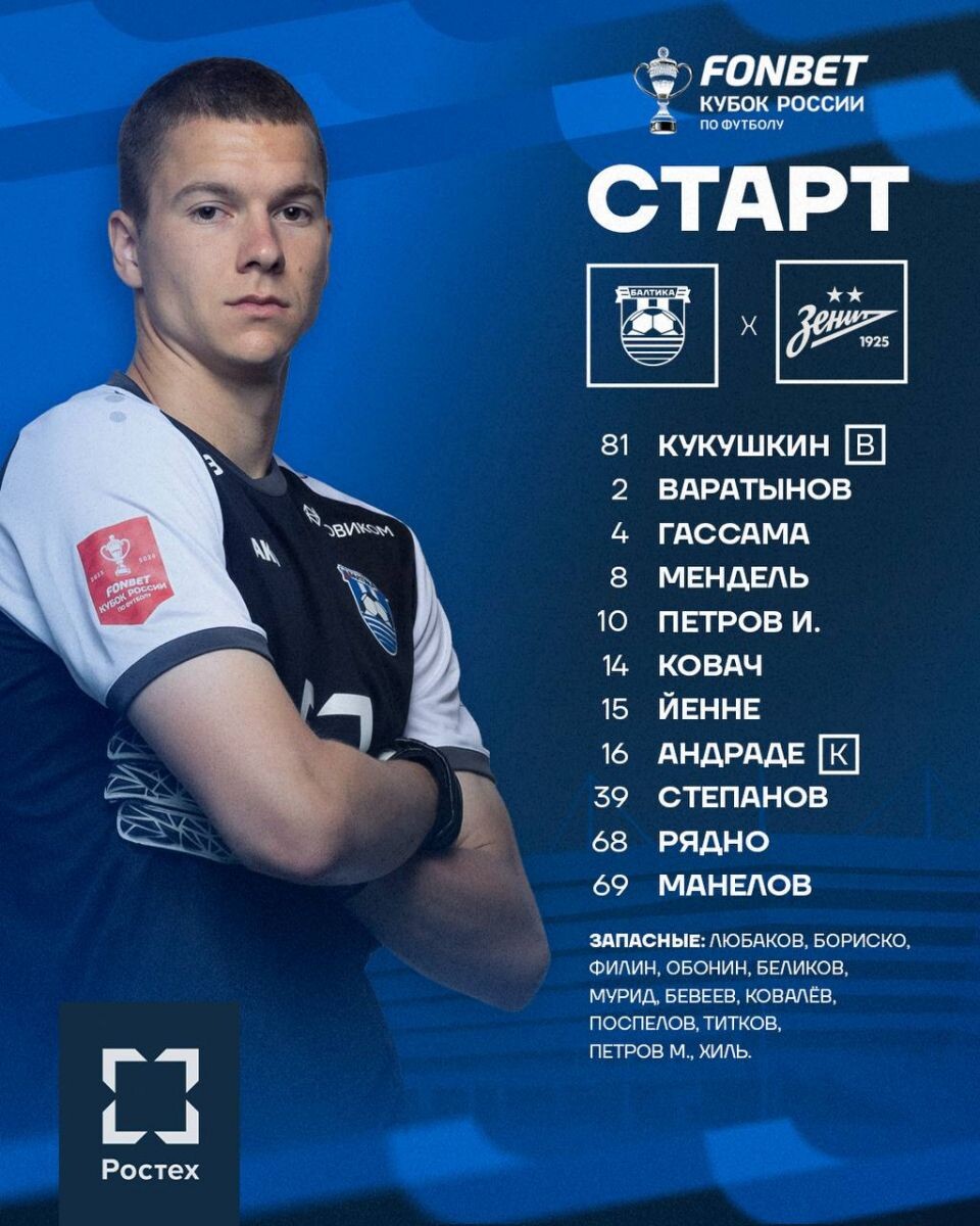 В субботу, 3 марта 2026 года, стартовал четвертьфинальный матч в рамках розыгрыша ФОНБЕТ Кубка России по футболу. Встреча проходит в «Пути РПЛ» между командами «Балтика» (Калининград) и «Зенит» (Санкт-Петербург). Официально объявлены стартовые составы команд. За калининградскую «Балтику» на поле вышли: Кукушкин, Варатынов, Гассама, Мендель, Петров, Ковач, Йенне, Андраде, Степанов, Рядно и Манелов. Состав петербургского «Зенита» представлен следующими футболистами: Латышонок, Вега, Алип, Нино, Дркушич, Барриос, Педро, Кондаков, Луис Энрике, Мостовой и Джон Дуран. Обслуживает встречу бригада арбитров под руководством Инала Танашева. Ассистентами главного арбитра выступают Рустам Мухтаров и Станислав Попков. Резервный судья — Игорь Капленков. За работу системы видеопомощи арбитрам (VAR) отвечает Сергей Карасев, ассистент VAR — Максим Гаврилин. Прямая трансляция матча доступна по ссылке 0+