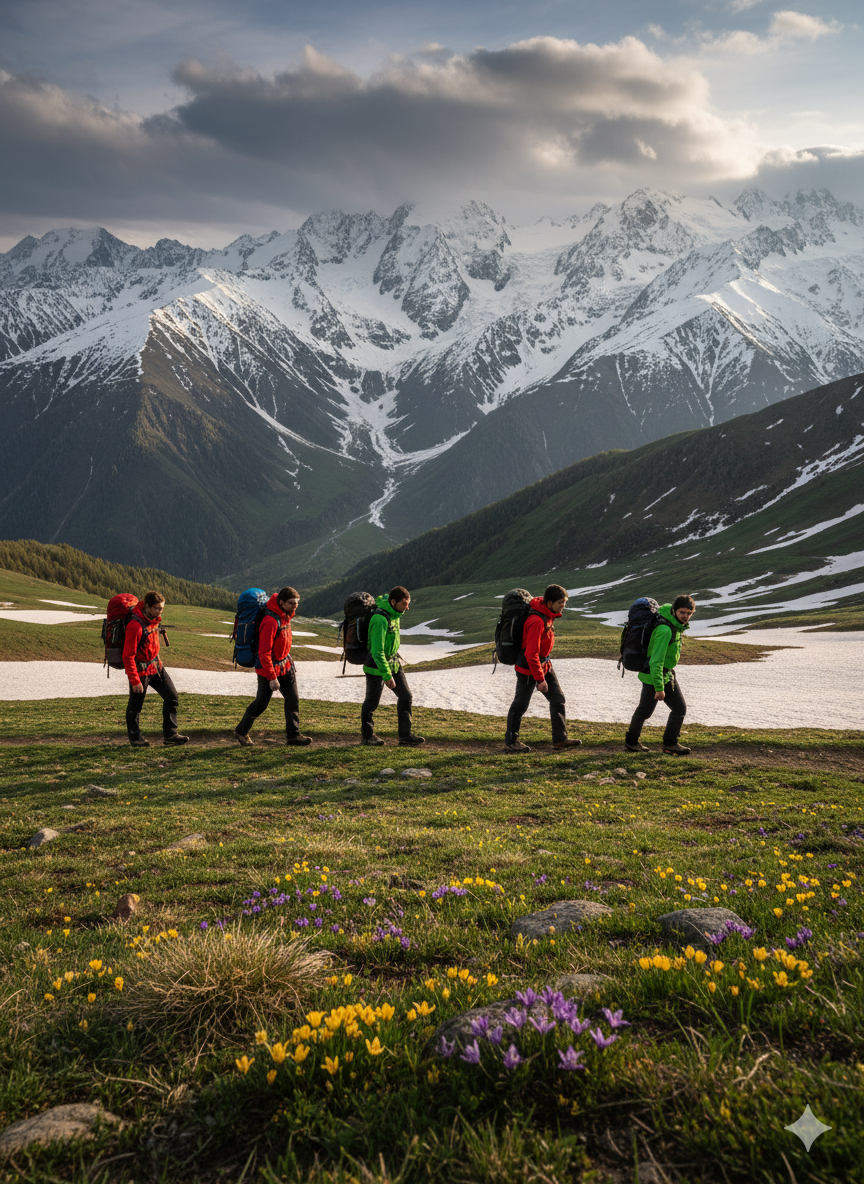 Канатная дорога поднимает на высоту 3168 метров, откуда открывается панорама трёх хребтов. Апрель хорош тем, что снег ещё держится наверху, цены на проживание ниже высокого сезона, а по тропам уже можно прогуляться пешком среди первых весенних цветов.