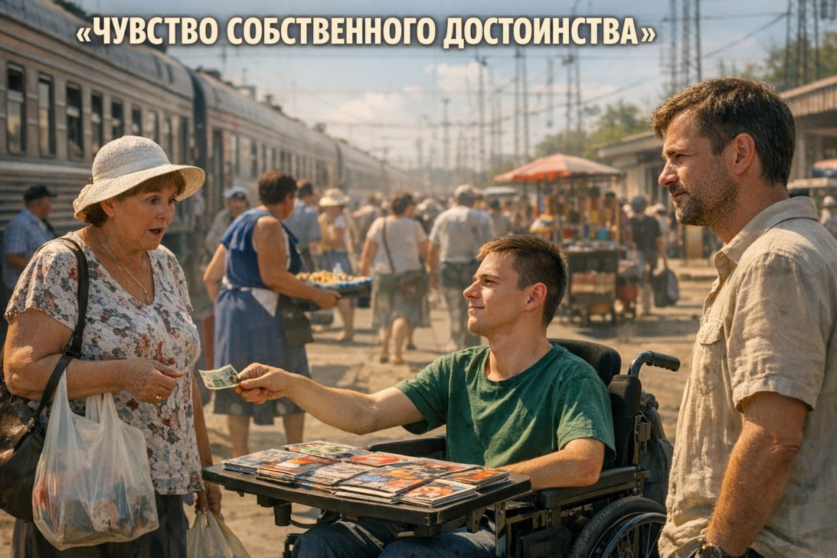 По перрону катился на инвалидной коляске паренёк лет двадцати, с импровизированным столиком, на котором лежали красочные журналы и газеты. У парня были явные признаки церебрального паралича. Не обращая внимания на свой недуг, он предлагал проезжающим приобрести имеющуюся у него в ассортименте литературу. Одна сердобольная пассажирка пожалела парня и протянула ему денежную купюру достоинством в сто рублей. Тогда парень обратился к ней с вопросом.