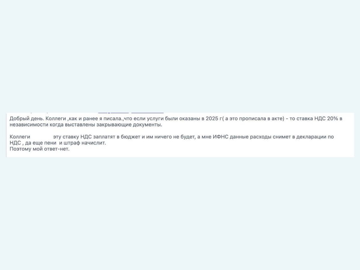 Ситуацию прислал подписчик, это рубрика «спросите у коллег». Клиенту оказаны услуги в августе 2025 года. Из-за внутренней бюрократии, сумму утвердили в феврале 2026 года, когда соответственно и выставлены закрывающие со ставкой 22%. Контрагент отказывается принимать закрывающие, цитирую 😄"услуги за 25 год, соответственно ставка должна быть 20%, исправьте". Кто прав? В скрине - довод бухгалтерии, которая хочет документы со ставкой 20%. У нас в личке - недоумение коллеги. 🤯 Бухгалтер на той стороне переживает, что налоговая увидит услуги за 2025 год, и не примет к вычету НДС по ставке 22% (который так-то будет уплачен). Объявляем конкурс лучшего совета для отправки на ту сторону (где НДС 20%)